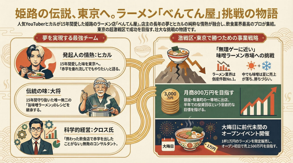 人気YouTuberヒカルが15年間、無名時代から愛し続けた兵庫県姫路市のラーメン店「べんてん屋」。その伝説の味が、ついに東京へ進出します。