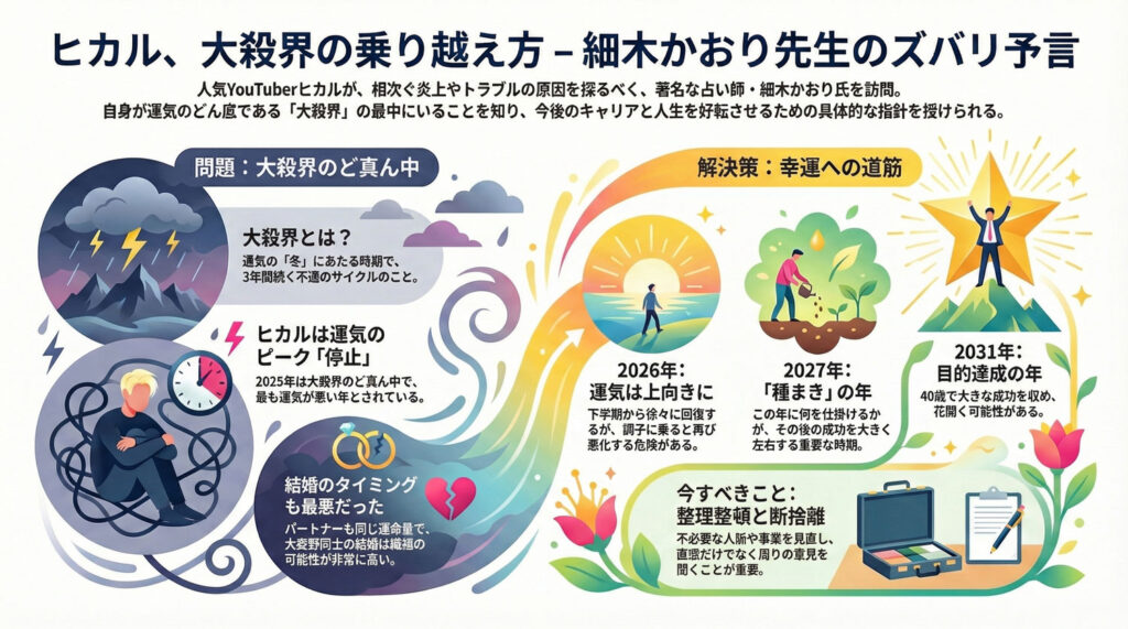 トップYouTuberヒカルに、占術家・細木かおりは「あんた絶対離婚するよ」と告げた。しかし、これは単なるゴシップではない。六星占術で最悪の運気「大殺界」の渦中にいるヒカルにとって、この京都訪問は、逆境をコンテンツに変え、未来への布石を打つための計算された戦略だった。