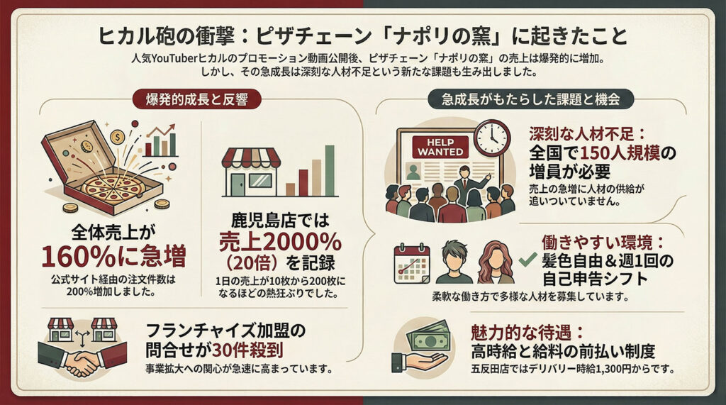 この「ヒカル砲」は業界にも衝撃を与えています。宅配ピザ業界はドミノ・ピザ、ピザーラ、ピザハットの大手3社がそれぞれ600〜800店舗を構える中、ナポリの窯は約100店舗。しかし、この動画公開後、フランチャイズの問い合わせが既に30件も来ているとのこと。業界の勢力図を塗り替えるかもしれない、大きな挑戦の幕開けを感じさせます。